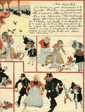 Doppelseite als Beilage zum Magazin "La joie des enfants". Bildergeschichte mit Überschrift: "Les Aventures extraordinaires de Julot et de Bobette. La perruque de Fraulein."