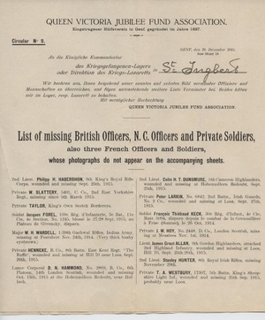Vermisstenliste der Queen Victoria Jubilee Fund Association vom 29. Dezember 1915