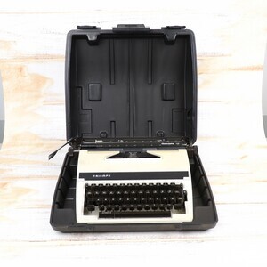 Die Triumph Werke Nürnberg AG stellten Motorräder, Fahrräder und Büromaschinen her. Im Jahr 1956 übernahm Max Grundig (Unterhaltungselektronik) erst die Aktienmehrheit der Triumph Werke, 1 Jahr danach, noch die der Adler Werke. Seit 2009 gehört Triumph Adler zu dem japanischen Kyocera Konzern. Die Schreibmaschine „Triumph Gabriele“ wurde nach Max Grundigs Enkeltochter benannt. Produziert wurde unser Modell vermutlich in den 1990er Jahren. Die Maschine ist in ein hellbeiges Plastikgehäuse eingebaut. Technisch handelt es sich um eine Typenhebel Maschine mit Wagnergetrieben und Segmentumschaltung. Ausgestattet ist das Modell u.a. mit einer Zeilenschaltung, 4 Reihiger QWERT Tastatur, Farbbandumschalter, Randlöser und automatischer Bandumschaltung. Der Anschlag ist angenehm weich. Die Maschine wurde in Japan für Triumph Adler produziert. Sie ist Baugleich mit der Adler Junior 12