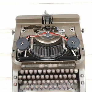 Ende 1946 wurden bei den ADLER Werken, wieder Schreibmaschinen hergestellt. Nach der Währungsreform wurden in kurzer Folge mehrere neue Modelle, mit modernen Design angeboten. 1955 produzierten die Adlerwerke über 100.000 Schreibmaschinen. Unser Objekt ist eine Büromaschine der Serie Universal. Das Gehäuse besteht aus Alu Guss und hat eine beige/hellbraune Lackierung. Gemäß der Seriennummer 994 366 war das Produktionsjahr 1955. Dieser Typ kam primär in Büros, Verwaltung oder auch in TV Anstalten zum Einsatz. Der komplette Wagen war, durch das Lösen von 2 Handschrauben, schnell ausgetauscht. Technisch handelt es sich um eine Typenhebelmaschine mit Vorderaufschlag, 4 reihiger QWERT Tastatur und Segmentumschaltung. Die Ausstattung entspricht den damaligen Anforderungen, wie Tabulator, Walzenfreilauf, fünffache Zeilenschaltung, 2 Farbenband mit automatischer Umschaltung sowie einer Anschlagregulierung. Auf der Rückseite findet sich das Firmenschild der Adler Werke