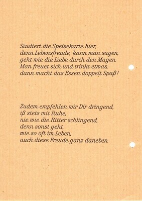 Gedruckt auf nachempfundenen Dokumentenpapier. Auf der Titelseite ein stilisiertes Wappen, das sich aus dem Ortswappen, darüber einem Kopfrüstungsteil mit Schulterschutz und Krone und links und rechts mit Blätterwerk zusammensetzt. Die Schrift darüber ist der Name des Veranstalters 'MGV Eintracht' (Männergesangsverein "Eintracht" Bad Bodendorf und unter dem Wappen 'Burgfest in Bad Bodendorf'. Innen sind die Speisen und Getränke bepreist und auf der Rückseite Empfehlungen zum Essen geschrieben.