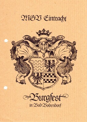 Gedruckt auf nachempfundenen Dokumentenpapier. Auf der Titelseite ein stilisiertes Wappen, das sich aus dem Ortswappen, darüber einem Kopfrüstungsteil mit Schulterschutz und Krone und links und rechts mit Blätterwerk zusammensetzt. Die Schrift darüber ist der Name des Veranstalters 'MGV Eintracht' (Männergesangsverein "Eintracht" Bad Bodendorf und unter dem Wappen 'Burgfest in Bad Bodendorf'. Innen sind die Speisen und Getränke bepreist und auf der Rückseite Empfehlungen zum Essen geschrieben.