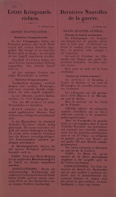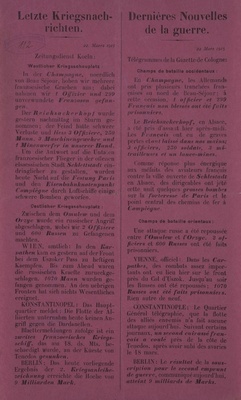 Wandanschlag in deutscher und französischer Sprache. Veröffentlicht im von Deutschland besetzten Gebiet im Westen (wahrscheinlich Frankreich, da zweisprachig) 19. März 1915. "Letzte Kriegsnachrichten. 19. Maerz 1915 Grosses Hauptquartier: Westlicher Kriegsschauplatz: Ein franzoesischer Vorstoss auf unsere Stellung am Suedhang der Lorettohoehe wurde abgewiesen. Franzoesische Teilangriffe in der Champagne, noerdlich von Le Mesnil, wurden durch einen Gegenangriff zum Stehen gebracht. Ein dort gestern Abend erneut einsetzender franzoesischer Angriff ist unter schweren Verlusten fuer den Feind zurueckgeschlagen. Franzoesische Flieger warfen auf die offene elsaessische Stadt Schlettstadt Bomben ab, von denen nur eine Wirkung erzielte, indem sie in das Lehrerinnenseminar einschlug, 2 Kinder toetete und 10 schwer verletzte. Als Antwort darauf wurde heute Nacht die Festung Calais mit Bomben schweren Kalibers belegt. Oestlicher Kriegsschauplatz: Die russischen Angriffe auf unsere Stellungen zwischen Pissa und Orzyc, sowie noerdlich von Przasnysz wurden auch gestern ohne Erfolg fortgesetzt. Westlich der Szkwa machten wir 900, oestlich der Szkwa 1000 Gefangene und erbeuteten 4 Maschinengewehre. Wien, amtlich: In den Karpathen wurde ein Angriff staerkerer feindlicher Kraefte nach blutigem Kampfe unter grossen Verlusten fuer den Gegner zurueckgeschlagen. Konstantinopel: Das Hauptquartier meldet: Ein Teil unserer Flotte bombadierte heute frueh die Schiffswerft und den Uebungsplatz fuer Torpedoboote westlich Feodosia; St.-Krim wurde in Brand geschossen. Heute frueh eroeffnete die feindliche Flotte ein heftiges Feuer gegen die Dardanellenforts, welche das Feuer erfolgreich erwiederten; das franzoesische Panzerschiff ’Bouvet’ wurde dabei in den Grund gebohrt. Paris: Dem ’Matin’ zufolge ordnete der Kriegsminister die Einberufung des Jahrgangs 1916 an."