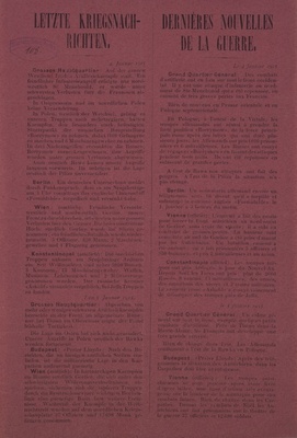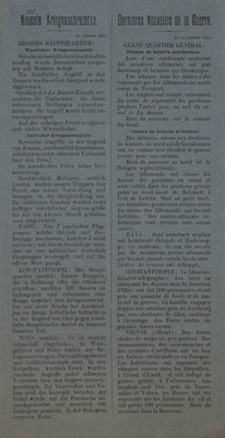Wandanschlag in deutscher und französischer Sprache. Veröffentlicht im von Deutschland besetzten Gebiet im Westen (wahrscheinlich Frankreich, da zweisprachig) 25. Januar 1915. "Neueste Kriegsnachrichten. 25. Januar 1915 Grosses Hauptquartier: Westlicher Kriegsschauplatz: Der 23. Januar verlief im allgemeinen ohne besondere Ereignisse. Im Argonnenwalde wurden zwei franzoesische Angriffe muehelos zurueckgewiesen. In den Vogesen, am Hartmannsweiler-Kopf und nordoestlich Steinbach, machten wir Fortschritte und nahmen 50 franzoesische Jaeger gefangen. Oestlicher Kriegsschauplatz: In Ostpreussen und im noerdlichen Polen ist keine Veraenderung eingetreten. Unser Angriff gegen den Sucha-Abschnitt bei Borzymow war erfolgreich. Feindliche Angriffe wurden unter schweren Verlusten fuer die Russen abgeschlagen. Russische Angriffe in der Gegend nordwestlich Opoczno scheiterten. Berlin (amtlich): Bei einem Vorstoss unserer Panzerkreuzer ’Seydlitz’, ’Derftlinger’, ’Moltke’ und ’Bluecher’ in Begleitung von 4 kleinen Kreuzern und 2 Torpedoflotillen kam es am Sonntag Vormittag in der Nordsee zu einem Gefecht mit englischen Streitkraeften in Staerke von 5 Schlachtkreuzern, mehreren kleinen Kreuzern und 26 Torpedobootzerstoerern. Der Gegner brach nach 3 Stunden das Gefecht 70 Seemeilen nordwestlich von Helgoland ab. Nach den bisherigen englischen Meldungen verloren die Englaender einen Schlachtkreuzer; von den deutschen Schiffen ist der Panzerkreuzer ’Bluecher’ gesunken. Alle uebrigen deutschen Streitkraefte kehrten in die Haefen zurueck. Wien (amtlich): An der galizisch-polnischen Front ist keine Veraenderung eingetreten. Auch in den Karpathen ist die Lage im Allgemeinen unveraendert. Aus mehreren vorgeschobenen Stellungen suedlich der Passhoehe wurden die Russen zurueckgedraengt. In der Bukowina herrscht nach den letzten erfolgreichen Kaempfen Ruhe. Auf dem suedlichen Kriegsschauplatze keine Ereignisse."