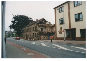 Farbfotografie, die die Straßenfront des Werksgeländes der Firma Didier in Bendorf, während des Abriss 1999 des Wohnhauses von Theodor Neizert an der Kreuzung Hauptstraße/Alter Weg zeigt. Nach dem Abriss entstand im Jahr 2000 ein Einkaufszentrum an dieser exponierten Stelle. Nur das Gebäude am rechten Bildrand ist vom Abriss verschont worden. Der Fabrikant Theodor Neizert hatte zuerst eine Kalk- und Ziegelbrennerei aufgebaut und stellt ab 1861 feuerfeste Steine (Schamottsteine) her. Aus dieser Fabrik gingen später die späteren Rheinischen Schamott- und Dinaswerke (später Didier-Werke) hervor. Er lebte in unmittelbarer Nähe der Fabrik in einem großen Wohnhaus mit Garten Ecke Hauptstraße / Alter Weg. 1863 heiratete seine Tochter Ida, den Arzt Dr. Konrad Wiegand, der in Bendorf als Badearzt tätig war. 1864 kam Sohn Theodor zur Welt, der spätere berühmte Archäologe, der Ausgrabungen in Priene, Milet und Pergamon durchführte und das neue Pergamon-Museum in Berlin aufbaute. Nach ihm wurde die Wiegand-Straße in Bendorf benannt.