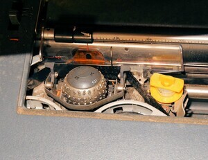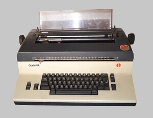 1930 erhielt die Europa Schreibmaschinen AG aus Erfurt den international geschützten Markennamen „Olympia“. Nach dem 2.Weltkrieg begannen Mitarbeiter des Erfurter Werkes in Wilhelmshaven mit der Schreibmaschinen Produktion. Das Wilhelmshavener Werk firmierte ab 1950 „Olympia Werke West GmbH“ und ab Juni 1954 erhielt das Unternehmen seine bekannte Firma Olympia Werke AG. Seit 1959 baute Olympia auch elektrische betriebene Modelle. Der Typ „SGE“. (S für Schreibmaschine G für groß und E für elektrisch) wurde in mehreren Varianten hergestellt. Unsere Maschine ist mit dem modernen Kugelkopf ausgestattet, der den Typenkorb ersetzte. Sie stammt aus den 1970 er Jahren und hat ein dunkel-/hellgraues Gehäuse. Im Betrieb verbrauchte die SGE 70 Watt/Std. Auf der Rückseite ist ein Aufkleber vom TÜV angebracht wonach die Maschine im Dez. 1987 geprüft wurde. Ausgestattet ist sie mit allem Zubehör einer Büromaschine. z Bsp. Tabulator, 2 Farbenband, Matritzenbeschiftung etc.