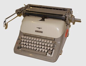 Seit Ende 1946 stellen die ADLER Werken, wieder Schreibmaschinen her. Nach der Währungsreform erscheinen, in kurzer Folge, neue Modelle mit modernen Design. Unser Objekt ist eine Büromaschine der Serie Universal. Das Gehäuse besteht aus Alu Guss und hat eine beige/hellbraune Lackierung. Lt. der Seriennummer 1.265.043 war das Produktionsjahr 1958. Dieser Maschinentyp kam primär in Büros, Verwaltung oder auch in TV Anstalten zum Einsatz. Der komplette Wagen kann, durch das Lösen von 2 Handschrauben, schnell ausgetauscht werden. Technisch handelt es sich um eine Typenhebelmaschine mit Vorderaufschlag, 4 reihiger QWERT Tastatur und Segmentumschaltung. Die Ausstattung entspricht den damaligen Anforderungen wie Walzenfreilauf, fünffache Zeilenschaltung, 2 Farbenband mit automatischer Umschaltung sowie einer Anschlagregulierung. Bemerkenswert bei unserem Objekt ist der fehlende Tabulator. Ungewöhnlich für eine schwere Büromaschine.