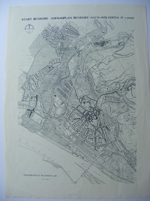 Auf Leinen aufgeklebte geologische Karte von Bendorf: "3215. Bendorf. Geologisch bearbeitet durch H. Quiring. Aufnahme abgeschlossen 1927". Auf der Karte sind neben den vorkommenden Gesteinsarten auch die Bergwerksfelder für Braunkohle, Eisen und sonstige Erze eingezeichnet.