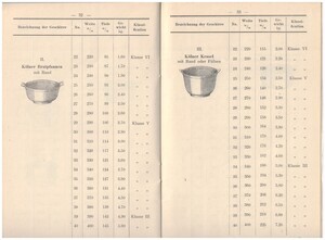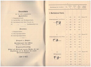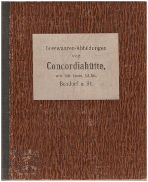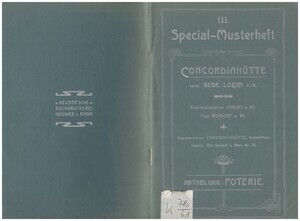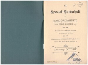 Gebundenes Musterheft der Concordiahütte mit einer gedruckten Übersicht aller Töpfe, Gefäße etc. aus Eisenguss aus dem Jahre 1903. Der Katalog umfasst 38 Seiten und wurde in der Heuser´schen Buchdruckerei in Neuwied am Rhein hergestellt. Der Einband ist aus grünblauem Karton und trägt auf der Vorseite folgende Beschriftung: "III. / Special-Musterheft / der / CONCORDIAHÜTTE / vorm. GEBR. LOSSEN A.-G. / Eisenbahnstation ENGERS a. Rh. / Post BENDORF a. Rh. / Telegramm-Adresse: CONCORDIAHÜTTE, Bendorfrhein. / Telephon: Amt Bendorf a. Rhein No. 33. / ABTHEILUNG: POTERIE."