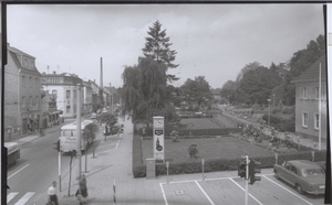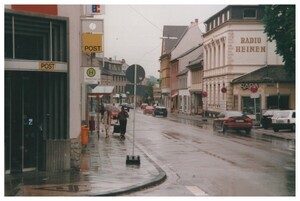 Die Fotografie zeigt die Einmündung der Poststraße in die Hauptstraße in Bendorf um 1998. Am linken Bildrand ist der Eingang in die Filiale der Deutschen Post AG und die unmittelbar daneben Bushaltestelle zu erkennen. Am rechten Bildrand ist das Geschäftsgebäude "Radio Heinen" an der Einmündung in den Stadtpark zu erkennen. Im Stadtpark befinden sich die Gebäude des städtischen Rathauses.