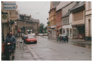 Die Farbfotografie zeigt den Blick in Richtung Kreuzung Hauptstraße/ Alter Weg in Bendorf um 1998 an einem Regentag. Der Fotograf steht in etwa auf Höhe der Poststraße. Auf der linken Straßenseite sind die "Park-Apotheke", das frühere "Hotel-Restaurant Dalmatia" und auf der rechten Seite weitere Geschäfts- und Wohnhäuser.