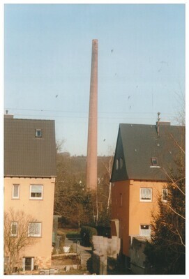 Die Farbfotografie zeigt den Kamin des Didier-Werksgeländes in Bendorf, kurz vor seiner Sprengung. Das Didier-Werksgelände wurde im Jahr 1999 abgerissen, im Jahr 2000 entstand an gleicher Stelle das Einkaufszentrum Bendorf "Kaufland".
