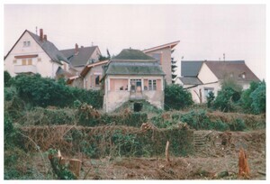 Farbfotografie von Klaus Geißler aus dem Jahr 2000 zeigt einen Blick von der Mühlenstraße in Bendorf auf das ehemalige barocke Gartenhaus der Familie Remy. Das Gartenhaus wurde im gleichen Jahr abgerissen und an der Stelle entstanden nebeneinander mehrere Einfamilienhäuser. Im Hintergrund sind Wohnhäuser an der Straße "In der Hohl" zu erkennen.
