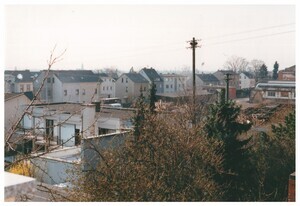 Die Farbfotografie zeigt einen Blick auf das Didier-Werksgelände in Bendorf während der Abbrucharbeiten 1999. In der Bildmitte sind die Häuser entlang der Concordiastraße zu erkennen.