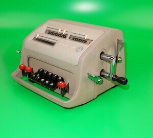 Die Firma Facit ist ein schwedisches Unternehmen, das auch in Deutschland ihre Rechenmaschinen herstellte. („Facit“ schwedisch = „Lösung“) Üblicherweise werden bei den Sprossenradmaschinen die Ziffern mittels kleiner Hebel eingestellt, die fest mit den Sprossenrädern verbunden sind. Bei den Facit Maschinen gibt es stattdessen 10 Tasten zur Eingabe der Ziffern. Die manuelle Tischrechenmaschine wurde in Düsseldorf, etwa 1960 hergestellt. Das Gehäuse ist grau lackiert und besitzt neben der 10er Tastatur noch 2 rote Tasten. Sie dienen der Weiterschaltung um eine 10er Stelle nach links bzw. nach rechts. Die Maschine funktioniert einwandfrei und auch das Äußere hat kaum Gebrauchsspuren.