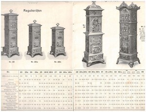 Musterheft ohne Einband, das sich zwei Seiten mit "Treppenrosten" befasst und auf 33 Seiten Öfen aus der Produktion der Concordiahütte abbildet.