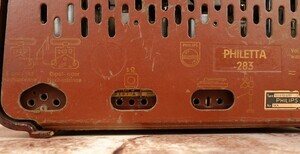 Ein kleines Tischradio von Philips in einem dunkelbraunen Bakelitgehäuse aus den Jahren 1958/1959. Die Front hat die klassische Aufteilung und ist horizontal geteilt. In der oberen Hälfte der Lautsprecher, darunter die Bedienelemente mit der Senderskala. Die Wellenbereiche WM/LW/KW/UKW sowie Ein/Aus werden über Drucktasten gesteuert. Die Drehregler beeinflussen Laut/Leise, die Klangfarbe und die Wahl eines Senders. Auf der Rückseite der Philetta 283 befinden sich Bananenstecker Anschlüsse für Plattenspieler, UKW Antenne, 2. Lautsprecher und Erdung. Der Ladenpreis lag 1958 bei 195 DM