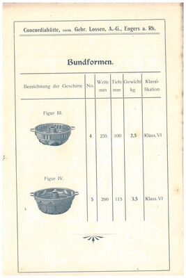 Zwei einzelne Seiten aus einem Katalog oder Musterbuch der Concordiahütte mit Abbildungen und Angaben zu Maßen und Gewicht aus der Zeit um 1900. Inv.-Nr. 9.029a zeigt Waffeleisen (Rund und rechteckig) und 9.029b die sog. Bundformen.