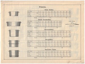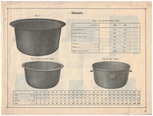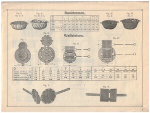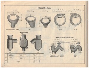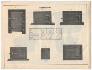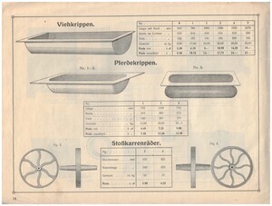 22-seitiger Produktkatalog der Concordiahütte von 1914/1915. Der Katalog hat einen einfachen Einband aus grau gefärbtem dünnem Karton. Auf den Katalogseiten werden verschiedene Produkte wie Waffeleisen, Kuchenformen, Töpfe, Wandwasserbecken, Klosetts, Syphons, Fenster, Tierkrippen, Karrenräder und Roste für Regulieröfen angeboten. Dazu sind Abbildungen und Angaben zu Maßen, Gewicht und Preis zu finden.