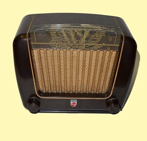 Kleins Tischgerät aus braunem Bakelit von Philips. Es wurde zwischen 1949 und 1950 in Eindhofen/Holland hergestellt. Das Röhrenradio verfügt über die Wellenbereiche LW/KW/MW die mittels Kippschalter am rechten Drehknopf ausgewählt werden. Der linke Drehknopf steht für Ein/Aus sowie Laut/Leise. Oberhalb der Lautsprecherabdeckung befindet sich die Senederskala aus Plastik, die in der Höhe über das Radio hinausragt. Auf der Rückseite gibt es nur Anschlüsse für eine externe Antenne und Erdung