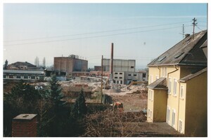 Die Farbfotografie zeigt den Abriss des Didier-Werksgeländes in Bendorf im Jahr 1999. Bagger schieben den Schutt vom Abriss auf Seite. An der Stelle des abgerissenen Werksgeländes entstand im Jahr 2000 ein Einkaufszentrum (Kaufland).