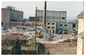Die Farbfotografie zeigt das Didier Werksgelände während des Abrisses im Jahr 1999. Die ersten Gebäudeteile der Didier-Werke Bendorf sind bereits abgerissen. Zwei Bagger räumen die Schuttberge beiseite. An der Stelle des Werksgeländes entstand im Jahr 2000 ein Einkaufszentrum (Kaufland).