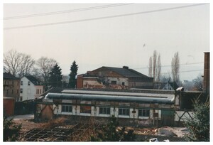 Die Farbfotografie zeigt einige Gebäude während des Abrisses der Didier-Werke Bendorf im Jahr 1999. Einige Gebäudeteile sind bereits abgerissen. An der Stelle der Didier-Werke entstand im Jahr 2000 ein Einkaufszentrum (Kaufland).