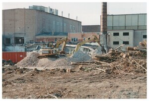 Die Farbfotografie zeigt die Schutthaufen vom Abriss der Didier-Werke in Bendorf 1999. Neben den großen Schutthaufen, die die Bagger zur Seite räumen, befindet sich ein Haufen abgesägter Bäume. An der Stelle der Didier-Werke entstand im Jahr 2000 ein Einkaufszentrum (Kaufland).