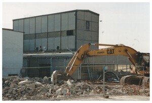 Die Farbfotografie zeigt den Abriss der Didier-Werke Bendorf im Jahr 1999. Im Vordergrund, hinter dem Bauzaun, beseitigt ein Bagger den Bauschutt. Im Hintergrund steht ein Arbeiter im Schutzanzug auf dem Dach eines Gebäudes und entfernt die Dachplatten. An der Stelle des Didier-Werksgeländes entstand im Jahr 2000 ein Einkaufszentrum (Kaufland).