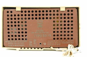 Ein minimalistisch ausgstattetes, kleines Tischradio von Grundig aus dem Jahr 1958. Das Gehäuse ist aus Plastik (Thermoplast) und hat eine hellgrün/graue Farbe. Mit diesem kleinen Radio lassen sich ausschließlich MW Sender hören. Es gibt an der Fronseite nur einen großen Drehregler für die Einstellung der Sendestationen. Eine Senderskala in der bekannten Form gibt es nicht. Auf der Rückseite ist lediglich ein Antennenaschluß vorhanden. 1958 kostete das Radio nur 82 DM