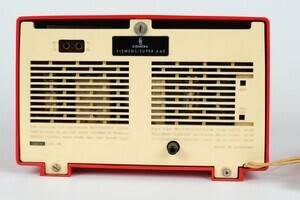 Unter der Fabriknummer 801 463 wurde diese kleine Tischradio von der Frma Siemens im Jahr 1956 hergestellt. Das Gehäue wurde aus rotem Plastik (Thermoplast) gefertigt. Die Vorder und Rückseite bestehen aus efenbeinfarbenen Plastik. Eine Besonderheit ist die Einstellung der Wellenbereiche. Mittels großem, schwarzem Drehknopf kann zwischen UKW und MW gewählt werden wobei sich die Skalenanzeigen mit um 180° dreht. Die beiden kleinen Dehregler stehen für Ein/Aus, Laut/Leise sowie der Senderwahl. An externen Anschlüssen gibt es nur Buchsen für Antennen. Der Ladenpreis lag 1956 bei 150 DM.