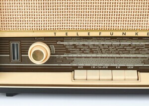 Ein kleineres Tischradio der Firma Telefunken, hergestellt in den Jahren 1962/1963. Das Chasisist aus Holz gefertigt und dunkel lackiert. Die Front ist klassisch, waagerecht geteilt. Hinter einer hellen Stoffabdckung befindet sich der Lautsprecher, darunter die auf Glas aufgedruckte Senderskala. Für eine optimale Senderabstimmung ist das Gerät an der Vorderseite mit einem Magische Auge ausgestattet. Neben zwei Drehreglern sind noch fünf Drucktasten für Ein/Aus, WM/LW/KW und UKW verbaut. Durch drücken derTasten LW und MW kann der Plattenspieler oder das Tonband zugeschaltet werden. Die dazugehörigen 5 pol. Diodenanschlüse sind auf der Rückseite. Ebenso der Anschluss für den 2. Lautsprecher und die Antennen. Ca. 300 DM musste ein Kunde 1962 für das Radio bezahlen.