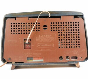 Ein Tischgerät, mittlerer Größe aus dem Jaht 1959. Hergestellt von NordMende aus Bremen Hemelingen. Das Gehäuse ist aus Holz, in dunklem Nussmaum furniert und glänzend lackiert. Die Frontseite ist klassisch aufgebaut. Im oberen Bereich, hinter einer Stoffabdeckung ist der Lautsprecher untergebracht. Ebenfalls im oberen Bereich gibt es 3 Drucktasten für die Klangfarben Solo, Orchester und Sprache. In der unteren Hälfte befinden sich die Sendestationen, die Drehregler und 6 Drucktasten für die Wellenbereiche MW/LW/KW/UKW/Ein-Aus unddie Zuschaltung eines Tonbandes/Plattenspieler. Das NordMende Radio ist außerdem noch mit einem Magischen Auge ausgestattet, das eine optische Hilfe zur genauen Sendereinstellung darstellt. Der Preis 1959 lag bei ca. 250 DM