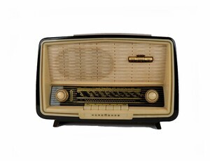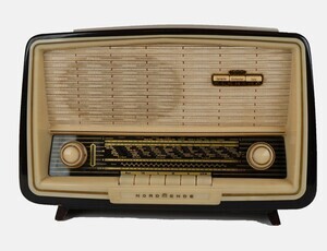 Ein Tischgerät, mittlerer Größe aus dem Jaht 1959. Hergestellt von NordMende aus Bremen Hemelingen. Das Gehäuse ist aus Holz, in dunklem Nussmaum furniert und glänzend lackiert. Die Frontseite ist klassisch aufgebaut. Im oberen Bereich, hinter einer Stoffabdeckung ist der Lautsprecher untergebracht. Ebenfalls im oberen Bereich gibt es 3 Drucktasten für die Klangfarben Solo, Orchester und Sprache. In der unteren Hälfte befinden sich die Sendestationen, die Drehregler und 6 Drucktasten für die Wellenbereiche MW/LW/KW/UKW/Ein-Aus unddie Zuschaltung eines Tonbandes/Plattenspieler. Das NordMende Radio ist außerdem noch mit einem Magischen Auge ausgestattet, das eine optische Hilfe zur genauen Sendereinstellung darstellt. Der Preis 1959 lag bei ca. 250 DM
