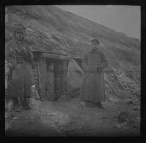 Soldaten im Winter vor einem Stolleneingang; 1914-1918. Im Historischen Museum der Pfalz war vom 29.4.2014 bis 24.9.2017 die Ausstellung "1914 - 1918. Die Pfalz im Ersten Weltkrieg" zu sehen. Auf einen öffentlichen Aufruf hin meldeten sich zahlreiche Privatpersonen, ihre Objekte wurden in dieser Sammlung erfasst und z. T. auch in der Ausstellung gezeigt. Die Objekte befinden sich im Eigentum der Privatpersonen und sind nicht Teil der Sammlungen des Historischen Museums der Pfalz.