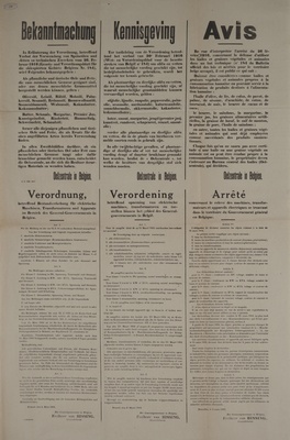 Wandanschlag in deutscher, niederländischer und französischer Sprache Herausgegeben vom General-Gouverneur des besetzten Belgiens, Freiherr von Bissing, am 22. September 1915 in Brüssel Verbot der Herstellung und des Handelns mit Landkarten von Belgien, Deutschland, Frankreich, Italien, Österreich-Ungarn, Russland, Serbien oder Türkei im Massstab von 1 : 100.000 oder darunter sowie Reliefkarten