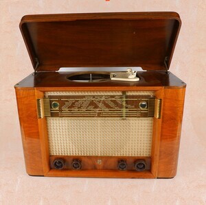 Eine Radio/Phono Kombination von Philips aus dem Jahr 1953. Das Chassis ist aus Holz gefertigt, Nussbaum hell furniert und hochglanz lackiert. Das Kopfteil des Radios lässt sich anheben. Darunter befindet sich ein Philis Plattenspieler Typ AG 2003, von dem leider der Plattenteller fehlt. Er verfügt über 3 Geschwindigkeiten 78/45/33 U/pM. Die Front des Radios wird dominiert von der Stoffabdeckung. Im oberen Bereich ist eine getönte, ca. 10cm breite, Glasplatte angebracht mit golden aufgedruckten Senderstationen. Integiert in die Glasplatte ist ein Magischs Auge, das bei unserem Objekt fehlt. Im unteren Bereich der Abdckung befinden sich 4 Drehregler zu Bedinung. Der Linke ist für Ein/Aus und Lautstärke, es folgt ein Breitbandschalter in Kombination mit einer Klangblende. Der nächste Drehregler hat ebenfalls eine Doppelfunktion. Eingestellt werden die Wellenbereiche, UKW/MW/KW einschl. des Plattenspielers, sowie sowie die verschiedenen Kurzwellen Bänder. Der rechte Drehknopf dient der Senderwahl. Auf der Rückseite sind Anschlüsse für Antennen, Plattenspieler und 2. Lautsprecherr. Der Ladenpreis lag 1953 bei etwa 565 DM. Gekauft wurde unser Objekt 1953 in Berlin, kam -nach 1978- nach Mayen, dann nach 56659 Burgbrohl und ca. 2010 in unser Museum.