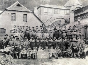 Gerahmtes Schwarzweiß-Foto, das die Belegschaft bzw. alle Arbeiter der Sayner Hütte im Jahre 1903 zeigt. Für diese Aufnahme wurden die Arbeiter und Meister der Sayner Hütte in fünf Reihen auf dem mittleren Hüttenplatz vor der ehemaligen Lehmformerei und dem Hochofengebäude der Gießhalle aufgestellt. Die Arbeiter der ersten Reihe sitzen und dahinter schließen sich alle stehend an. In vorderster Reihe halten die Arbeiter ein Schild mit der Aufschrift "Sayner Hütte 1903", auf dem mittig gekreuzt Eisen und Schlägel, als Symbol der Berg- und Eisenhüttenleute abgebildet ist. Rechts außen ist hinter einem Pfeiler halb verdeckt ein kleiner Junge mit Mütze zu erkennen. Solche gerahmten Fotografien wurden anlässlich von Jubiläen den Mitarbeitern der Krupp´schen Sayner Hütte überreicht. Abgebildet wurden von links nach rechts obere Reihe: Caspar Nieth, Anton Maid, Joseph Meurer, J. Kretzer, Adam Nieth, Peter Sander, Josef Müller, Kunstgießer Johann Opp, Peter Sander, Wilhelm Drescher, Kunstgießer Josef Opp, Josef Böckling, Kronimus, Peter Schmalenbach, Josef Göbel, Johann Reit, Josef Holler; zweite Reihe: Würz, Carl-August Wahner, Anton Müller, Peter Merl, Johann Hehn, Gerz, Peter Bernardi, Alfred Zamboni, Max Nieth, Adam Lehmann, Fritz Müller, Ferdinand Nieth, unbekannt, Peter Gelhard, Heuser, Freisberg, Peter Wolf, Bernhard Schmitz; dritte Reihe: Nuß, Peter Hummerich, Johann Müller, Saxer, Heinrich Krupp, Josef Jansen, Fritz Pritz, Fritz Sander, Aolf Lenau, Fritz Pohlmann, Wilhelm Kemp, Heinrich Syhr, Matthias Fröhlich, Peter Peters, Jakob Nett; vierte Reihe: Johann Engel, Josef Krupp, Matthias Schöneberg, Heinrich Merl, Josef Saxer, Maschinen-Meister Johann Hahn, Former-Meister Heinrich Lehmann, Ingenieur Schmidt, Schlosser-Meister Peter Merl, Schreiner-Meister Christian Pelzer, Platz-Meister und Kutscher Eberhard Scherach; fünfte Reihe: Bernhard Kuppler, Jean Schmitz, Otto Roßbach, Indorf, Kronimus (Stromberg), Johann Dillmann, Karl Klostermann, Christian Löhr, Heinrich Hummerich, Jakob Kemp, Peter Dahm, Peter Freisberg (Stromberg), J. Becker, Anton Kleudgen (vgl. Historisches Archiv Krupp WA 16 c 72 und Adressbuch Gemeinde Sayn 1910).