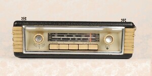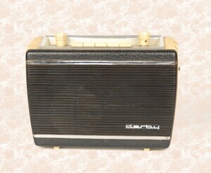Das Radio Derby von Blaupunkt stammt aus den Jahren 1963/64. Rein optisch ist es eine Kreuzung zwischen einem fest eingebautem Autoradio der 1950/1960er Jahren und einem Kofferradio. Damals waren Autoradios sehr begehrt, was eine hohe Diebstahlquote nach sich zog. Die Hersteller von Autoradios konstruierten zunächst herausnehmbare Geräte, dann abnehmbare Blenden, bis Kofferradio, mit Autoanschluss, den Markt eroberten. Unser Objekt erinnert optisch noch an fest eingebaute Geräte, ist aber ein klassisches Kofferradio. Es wurde unterhalb des Armaturenbretts in eine Halterung geschoben, die ihrerseits mit der Autoantenne und der Batterie verbunden war. So eine Authalterung war immer mit einem Aufpreis verbunden. Außerhalb des Autos erfolgte die Stromversorgung mit 6 x 1,5 Volt Batterien. Zum Auswechseln der Batterien wir die Rückseite abgenommen und der feuchtigkeitsgeschützte Batteriebehälter geöffnet. Ein Netztbetrieb ist nicht möglich. Die Rückseite des Radios ist mit schwarzem Leder bezogen, die Vorderseite mit einem schwarzem Kunststoffgitter abgedeckt. Im Angebot sind die Wellenbereiche UKW/KW/LW/KW , durch Tastendruck wählbar. Im Autobetrieb war die Senderskala beleuchtet. Zugeschaltet werden kann ein externe Plattensieler bzw. Tonbandgerät.