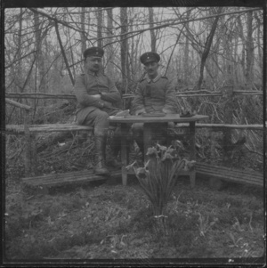 Zwei Soldaten sitzen auf einer selbstgebauten Bank an einem Tisch. Im Vordergrund befindet sich ein kleiner Garten mit Narzissen; 1914-1918. Im Historischen Museum der Pfalz war vom 29.4.2014 bis 24.9.2017 die Ausstellung "1914 - 1918. Die Pfalz im Ersten Weltkrieg" zu sehen. Auf einen öffentlichen Aufruf hin meldeten sich zahlreiche Privatpersonen, ihre Objekte wurden in dieser Sammlung erfasst und z. T. auch in der Ausstellung gezeigt. Die Objekte befinden sich im Eigentum der Privatpersonen und sind nicht Teil der Sammlungen des Historischen Museums der Pfalz.