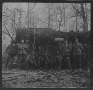 Gruppenportrait vor der Franz-Josef-Hütte; 1914-1918. Im Historischen Museum der Pfalz war vom 29.4.2014 bis 24.9.2027 die Ausstellung "1914 - 1918. Die Pfalz im Ersten Weltkrieg" zu sehen. Auf einen öffentlichen Aufruf hin meldeten sich zahlreiche Privatpersonen, ihre Objekte wurden in dieser Sammlung erfasst und z. T. auch in der Ausstellung gezeigt. Die Objekte befinden sich im Eigentum der Privatpersonen und sind nicht Teil der Sammlungen des Historischen Museums der Pfalz.