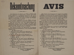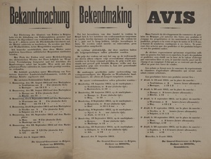Wandanschlag in deutscher, niederländischer und französischer Sprache Herausgegeben vom General-Gouverneur des besetzten Belgiens, Freiherr von Bissing, am 2. Oktober 1915 in Brüssel "Es ist zu meiner Kenntnis gekommen, dass die Behauptung aufgestellt und verbreitet worden ist, die Bestimmungen meiner Bekanntmachung vom 9. Januar d. J. über die Regelung der Requisitionen seien nicht innegehalten worden. Zur Begründung dieser Behauptung ist auf einzelne Fälle verwiesen worden, die bis dahin der Prüfung der zuständigen Behörden noch nicht unterbreitet worden waren und aus denen keinesfalls allgemeine Schlussfolgerungen gezogen werden können. Derartigen Behauptungen werde ich auf das schärfste entgegentreten. Dagegen werde ich es mir stets angelegen sein lassen, auf die genaue Befolgung der Bestimmungen meiner Bekanntmachung vom 9. Januar d. J. hinzuwirken. Falls irgend jemand Grund zu haben glaubt, dass ihm gegenüber diese Bestimmungen nicht innegehalten worden sind, fordere ich ihn hierdurch auf, die Angelegenheit dem Kaiserlichen Generalkommissar für die Banken in Belgien, Brüssel, 28 rue de la loi zur Prüfung zu unterbreiten."