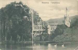 Kolorierte Lithographie mit Ansicht der Sayner Hütte, Schloss und Burg Sayn von 1830 nach einer Zeichnung von Carl Osterwald, in Stein gesetzt von dessen Bruder Georg Osterwald. Die Grafik ist ist gerahmt (Holzrahmen mit Glas). Am unteren Bildrand sind folgende Beschriftungen zu finden: links "Aufgenommen u. gezeichnet von C. Osterwald.", rechts "auf Stein gezeichnet von G. Osterwald.", mittig "Saynerhütte (aufgeklebtes Wappen) Schloss zu Sayn / 1830".