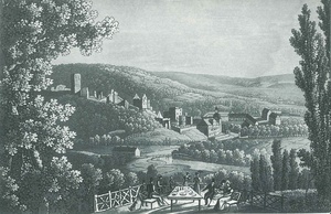 Lithographie Sayner Hütte, Schloss und Burg Sayn, 1830
