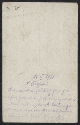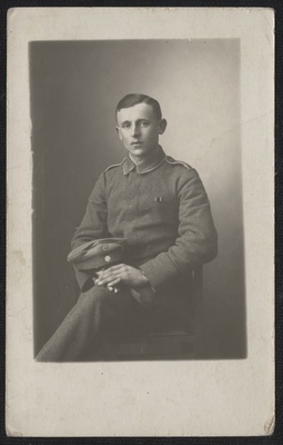 Portrait eines sitzenden Soldaten; Rückseite mit handschriftlicher Notiz in Sütterlin. Im Historischen Museum der Pfalz war vom 29.4.2014 bis 24.9.2017 die Ausstellung "1914 - 1918. Die Pfalz im Ersten Weltkrieg" zu sehen. Auf einen öffentlichen Aufruf hin meldeten sich zahlreiche Privatpersonen, ihre Objekte wurden in dieser Sammlung erfasst und z. T. auch in der Ausstellung gezeigt. Die Objekte befinden sich im Eigentum der Privatpersonen und sind nicht Teil der Sammlungen des Historischen Museums der Pfalz.