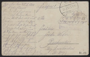 Portrait einer Gruppe von Soldaten im Freien auf gelaufener Feldpostkarte; Rückseite mit handschriftlicher Notiz in Sütterlin und Poststempel vom 25.5.17. Im Historischen Museum der Pfalz war vom 29.4.2014 bis 24.9.2017 die Ausstellung "1914 - 1918. Die Pfalz im Ersten Weltkrieg" zu sehen. Auf einen öffentlichen Aufruf hin meldeten sich zahlreiche Privatpersonen, ihre Objekte wurden in dieser Sammlung erfasst und z. T. auch in der Ausstellung gezeigt. Die Objekte befinden sich im Eigentum der Privatpersonen und sind nicht Teil der Sammlungen des Historischen Museums der Pfalz.