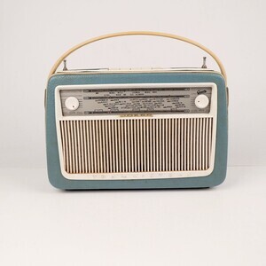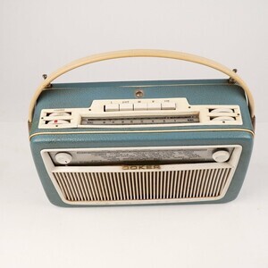 Das Kofferradio der Frma Graetz wurde in den Jahren 1961/1962 gefertigt. Die Rückwand wurde aus Plastik, der Rest des Cassis aus Holz hergestellt. Die Außenseite ist mit Taubenblauem Kunstlederleder bezogen. In die Rückseite sind 2 Stabantennen integriert sowie der Zugang zum Batteriefach. (5 x 1,5 Volt) Die Bedienelemente liegen auf der Oberseite des Radios. Mit Drucktasten werden die Wellenbereiche UKW/LW/MWund KW ausgewählt. Die Senderabstimmung, Ein/Aus, Laut/Leise sowie die Zuschaltung einer externen Quelle, erfolgt über senkrecht angeordnete Dehschalter. Höhen bzw Tiefen werden über 2 kleine Drehschalter, die in die Sendertabelle integriert sind, eingestellt. Das Radio hat an der Untersite einen Autoanschluss, der mit einer spezifischen Halterung genutzt werden kann. Der Ladenpreis dürfte so bei etwas 300 DM gelegen haben.