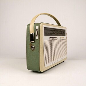 Ein Kofferradio aus den frühen 1960er Jahren. Vorder und Rückseite sind aus Bakelit, der Rest des Chassis, aus Holz gefertigt. Rundum bezogen mit Kunstleder, in den Farben weiß und grünlich. Auf der Vorderseite dominiert eine weiße Plastikabgdeckung, in die, eine Sendertabelle, Tasten für UKW/KW/MW und ein Drehregler zur Senderbstimmung , eingefügt sind. Die Stromverorgung erfolgt über 6 x 1,5 Volt Batterien. Zum wechseln der Batterien muss die Rückwand vollständig geöffnet werden. Im Innern klebt ein Zettel wonach das Gerät im Jan 1999 repariert wurde.