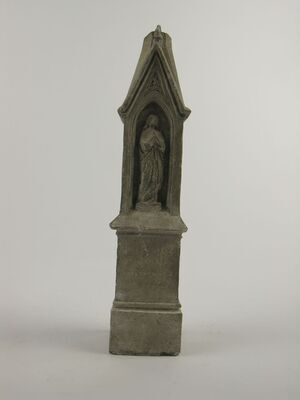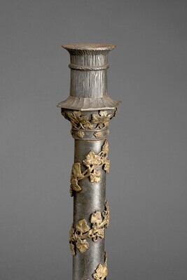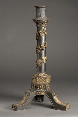 Altarleuchter im gotischen Stil aus Eisenguss. Alle aufgelegten Verzierungen wie Palmzweige, Weinranken, Weinblätter, Vierpässe etc. wurden feuervergoldet, der Untergrund ist geschwärzt. Der Leuchter steht auf drei massiven, breiten, hoch gebogenen Füßen, die als Verzierung Palmzweige aufweisen. Den Füßen schließt sich ein sechseckiger Sockel mit Mustern im gotischen Stil (Vierpässe, gotische Spitzbögen) an. Über dem Sockel erhebt sich eine Säule, um die sich Wein rankt. Den Abschluss bildet eine hohe Kerzentülle, die mit hochstehenden Ähren verziert ist. Der untere Rand der Tülle ist mit Weinblättern