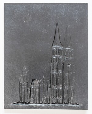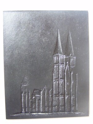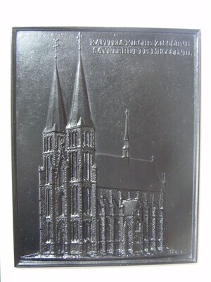 Aus Eisen gegossene Sayner Neujahrsplakette für das Neujahr 1858, die im Relief die ehemalige Kollegiatsstiftkirche von Kleve in einer Ansicht von Südwesten zeigt. 1341 ließ der Klever Graf Dietrich IX. das Kollegiatsstift Monterberg bei Kalkar nach Kleve verlegen. Als fortan landesherrliches Residenzstift kam diesem Stift eine herausragende Stellung zu. An Stelle der romanischen Johanneskirche entstand 1426 ein dreischiffiger Neubau, der als Hofkirche und Grablege der Klever Grafen diente. Die spätgotische Backsteinkirche mit schiefergedeckten Dächern und Turmhelmen verfügt über kein Querschiff. Die Idee eines polygonalen Chores und einer Doppelturmfassade übernahmen die Bauherren aus Xanten. Die Plakette ist auf der Vorderseite beschriftet: "KAPITELS-KIRCHE ZU CLEVE / SAYNERHÜTTE MDCCCLVIII".